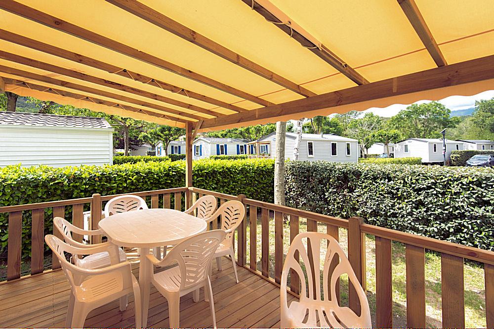 Campsite Le Vallespir has caravanning pitches and 76 mobile homes for rent for 2 to 8 people. They all have a covered terrace with two sunbeds to enjoy the outdoors during the day, as well as the beautiful summer evenings.